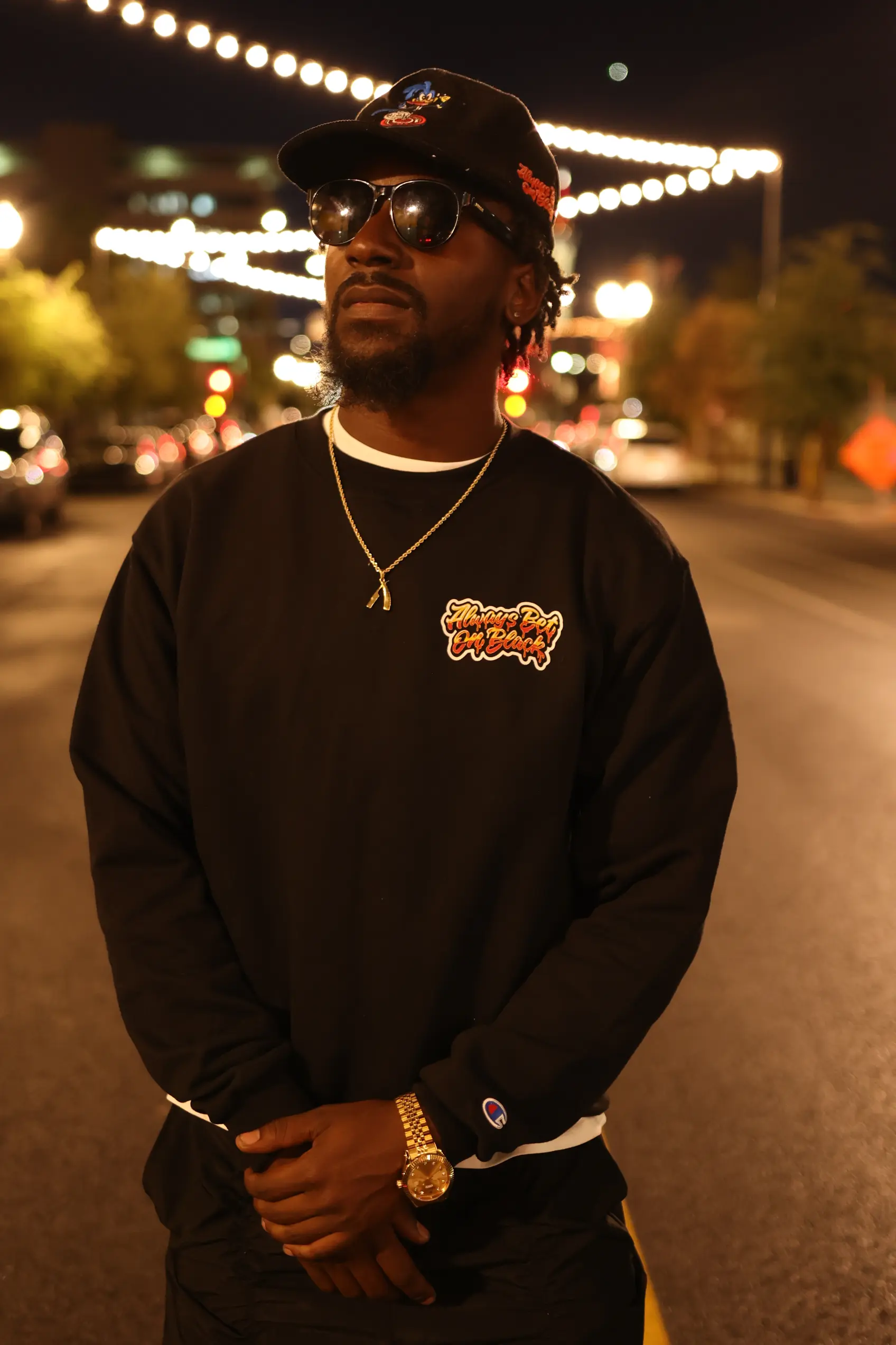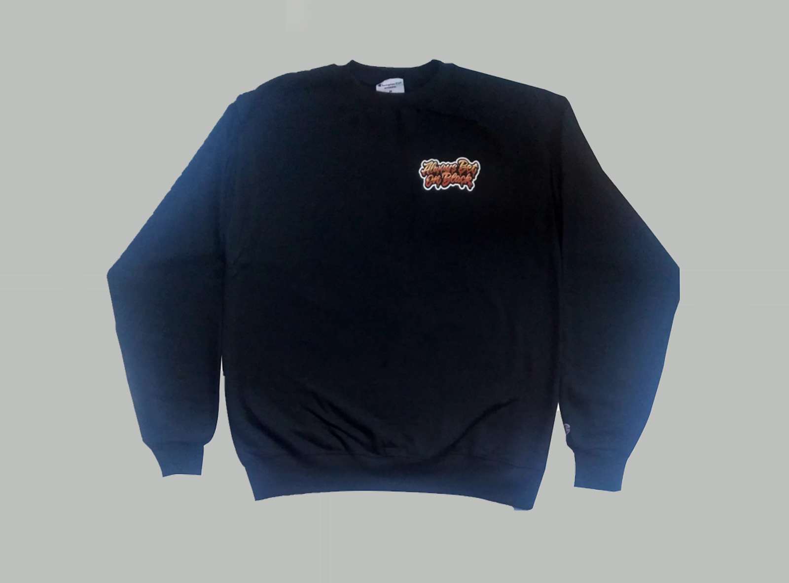 Champion® crewneck, small chest print front, large graphic back